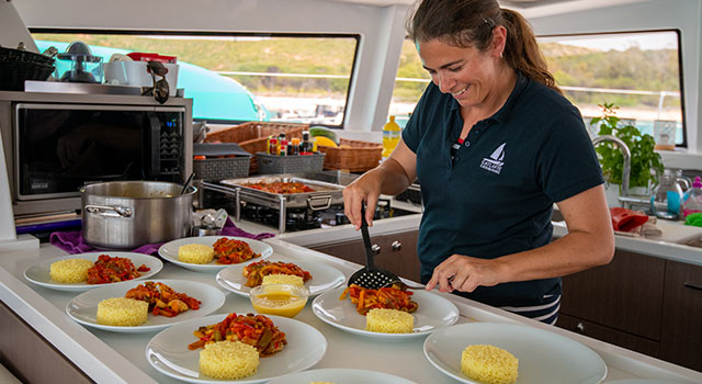Une cuisine fraîche et équilibrée, quelques desserts gourmands, des spécialités locales, sont concoctés à bord, sous vos yeux, par nos cuisiniers, soucieux de vous offrir des repas dignes d'une table d'hôtes.