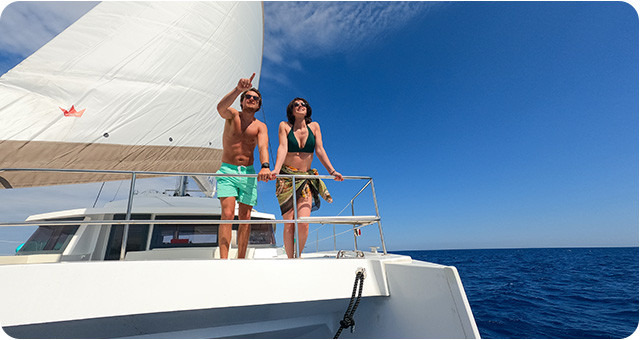 Admirer un coucher de soleil depuis le fly-bridge du catamaran, nager avec les poissons au réveil, apercevoir des dauphins au fil de l’eau... une immersion totale loin de l’effervescence du quotidien.